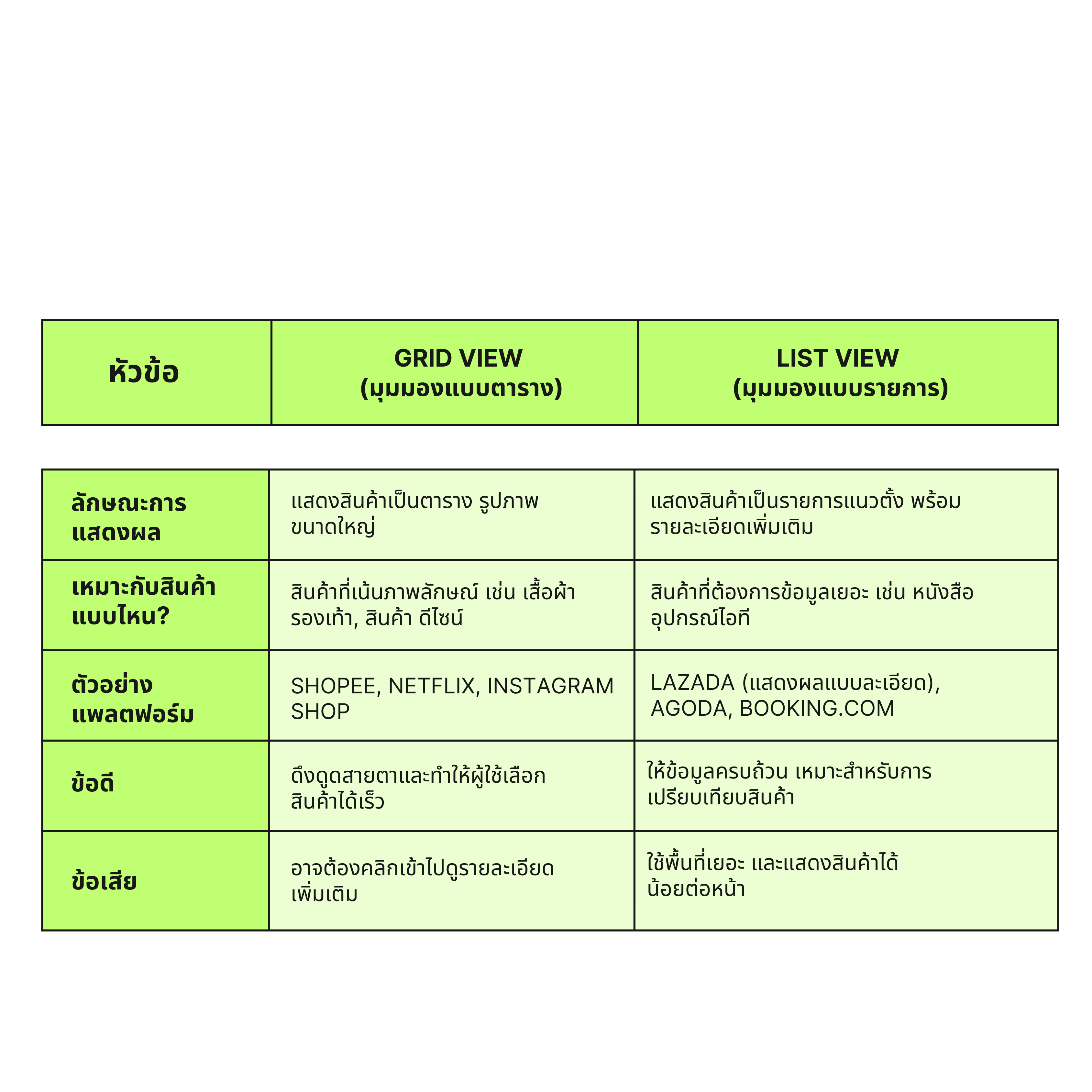 List View เหมาะกับสินค้าที่ต้องใช้ข้อมูลเปรียบเทียบ