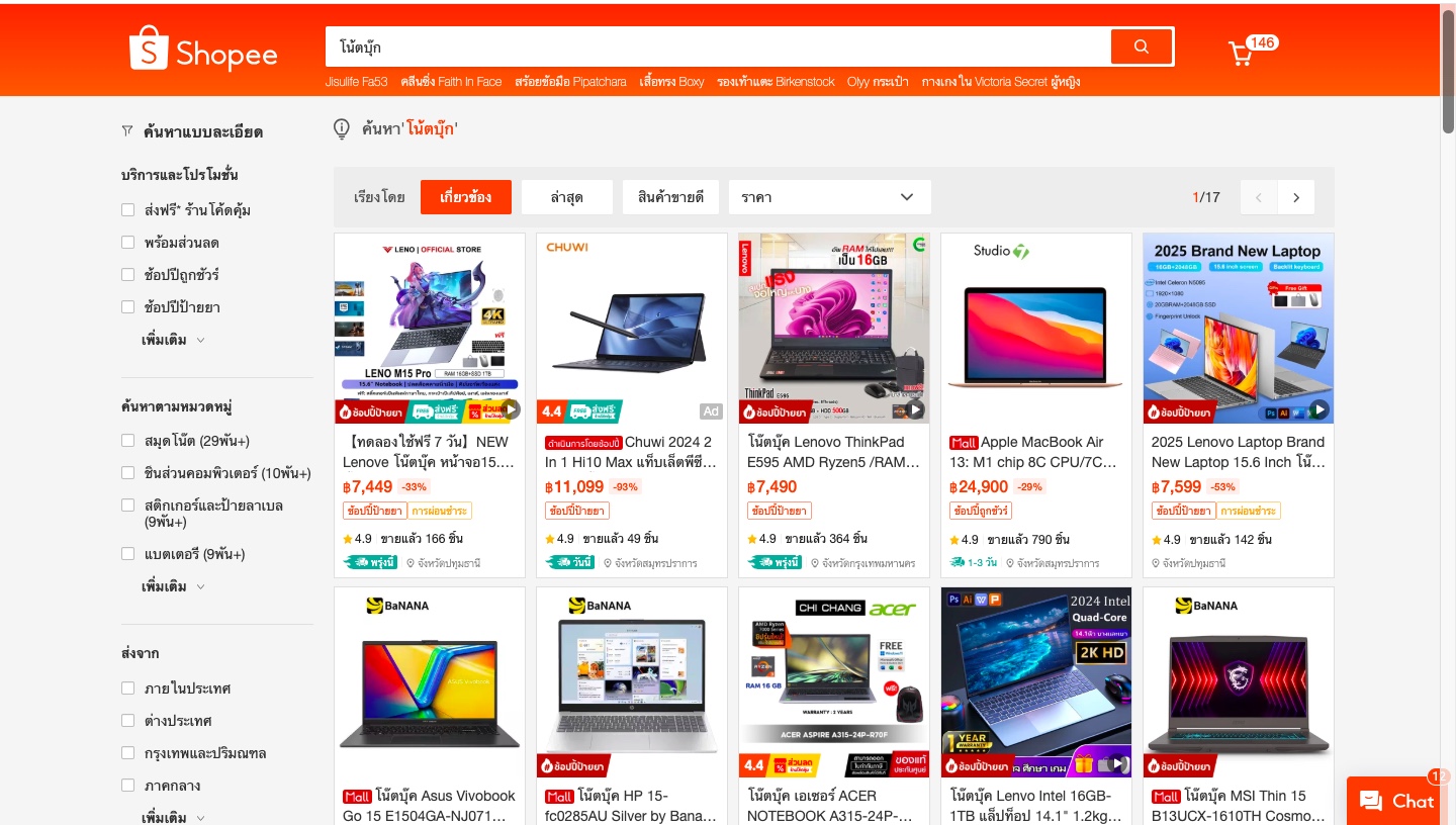 หากค้นหา "โน้ตบุ๊ก" ระบบอาจแสดง List View เพื่อให้เปรียบเทียบสเปกและราคาง่ายขึ้น