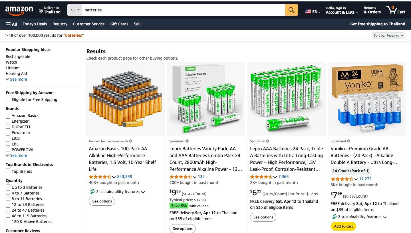 ค้นหา "โทรศัพท์มือถือ" ใน Amazon จะได้ List View พร้อมข้อมูลสำคัญ เช่น แบตเตอรี่, ขนาดหน้าจอ