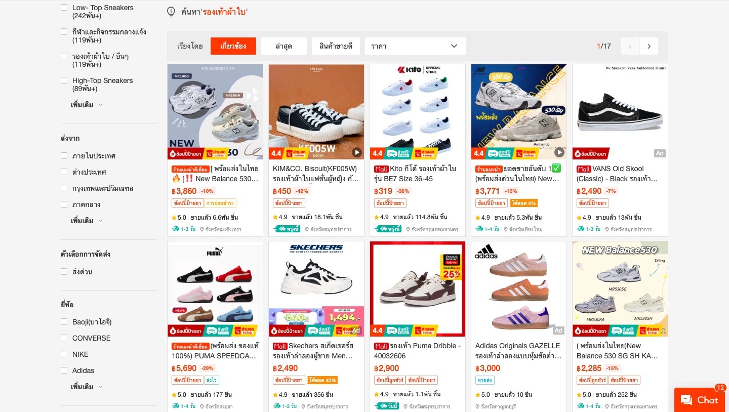 หากคุณค้นหา "รองเท้าผ้าใบ" ใน Shopee จะเห็นสินค้าใน Grid View เพื่อดูดีไซน์ได้ง่าย