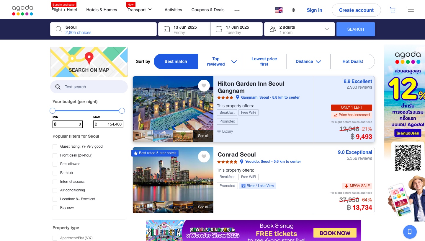 Booking.com & Agoda: ใช้ List View เพื่อให้ข้อมูลโรงแรมครบถ้วนพร้อมรายละเอียด